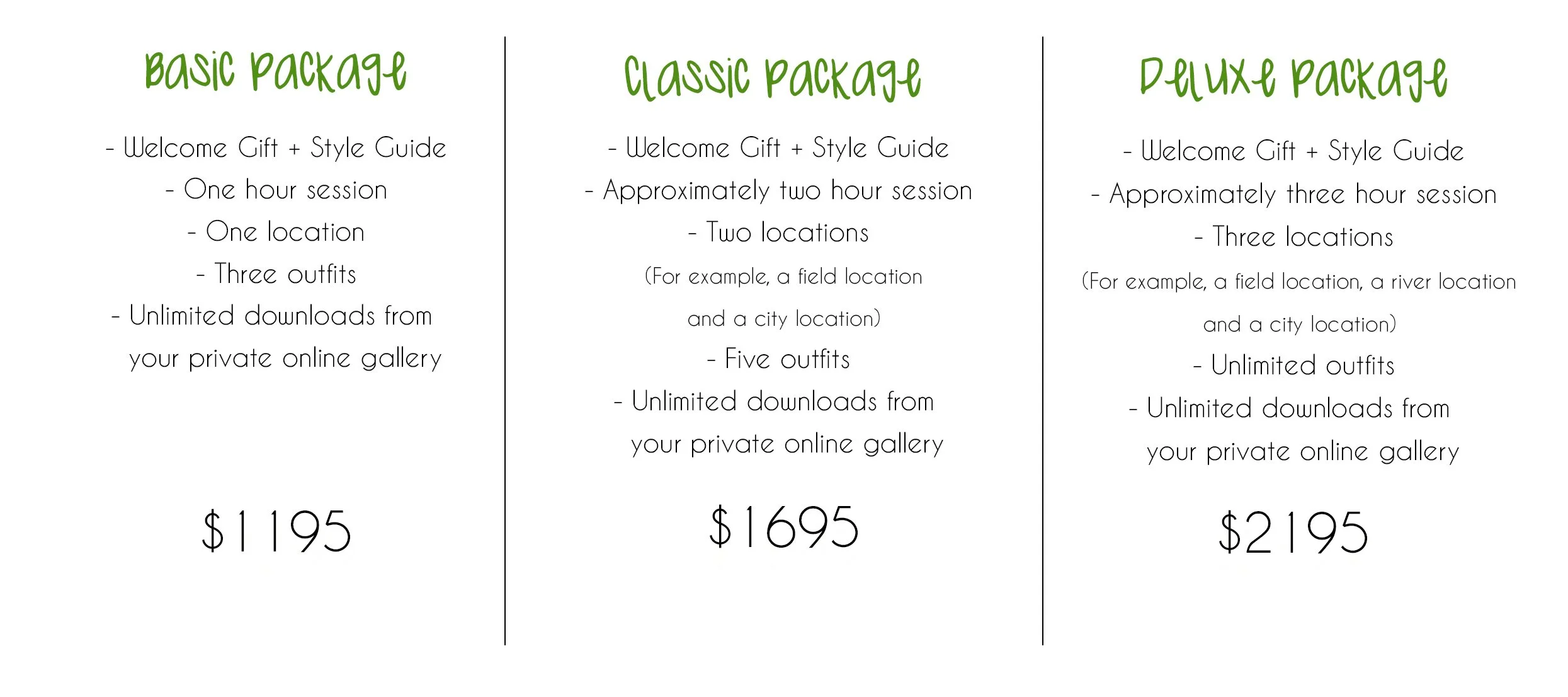 Please note that all packages require a non-refundable $200 retainer fee to reserve your date! The retainer fee is subtracted from your total, and the remaining amount is due the day of your photoshoot.
